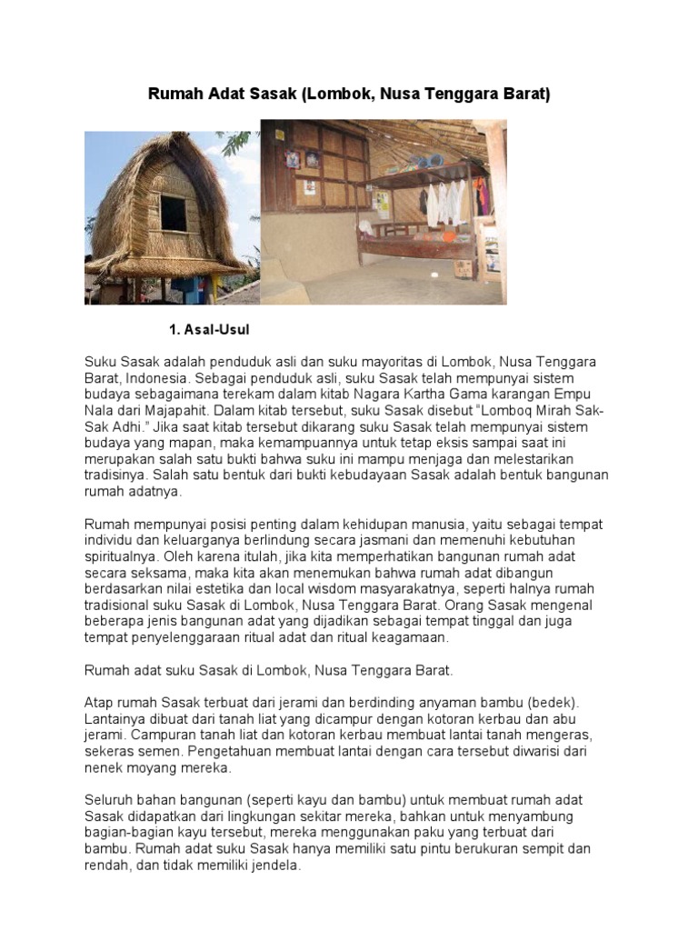 Rumah adat lombok pdf. Dimana daerah yang ada di bagian Indonesia Timur ini mempunyai kekayaan budaya yang bisa diketahui dan pelajari terutama ketika akan berkunjung ke daerah tersebut. Ruangan dalam Rumah Adat Sasak diatur sedemikian rupa sehingga mempunyai maksud-maksud tertentu. Bentuknya terbilang unik serta menarik yaitu rumah panggung yang ujung atapnya meruncing serta melebar sedikit kemudian lurus di bawah dan kembali melebar di bagian bawahnya.